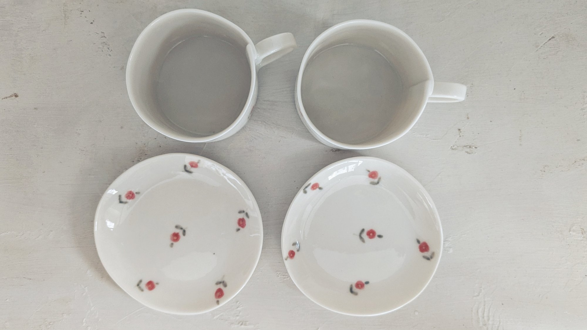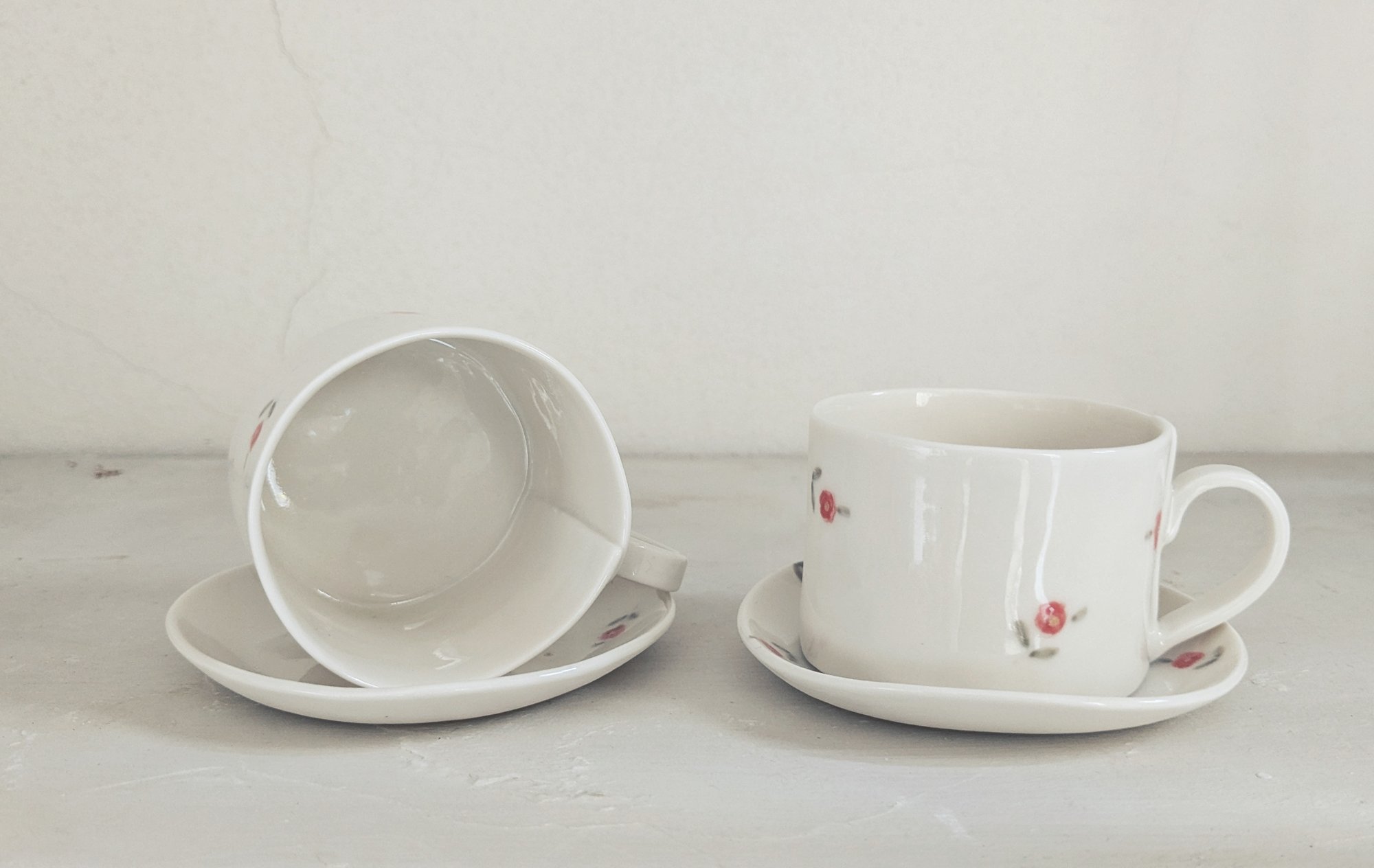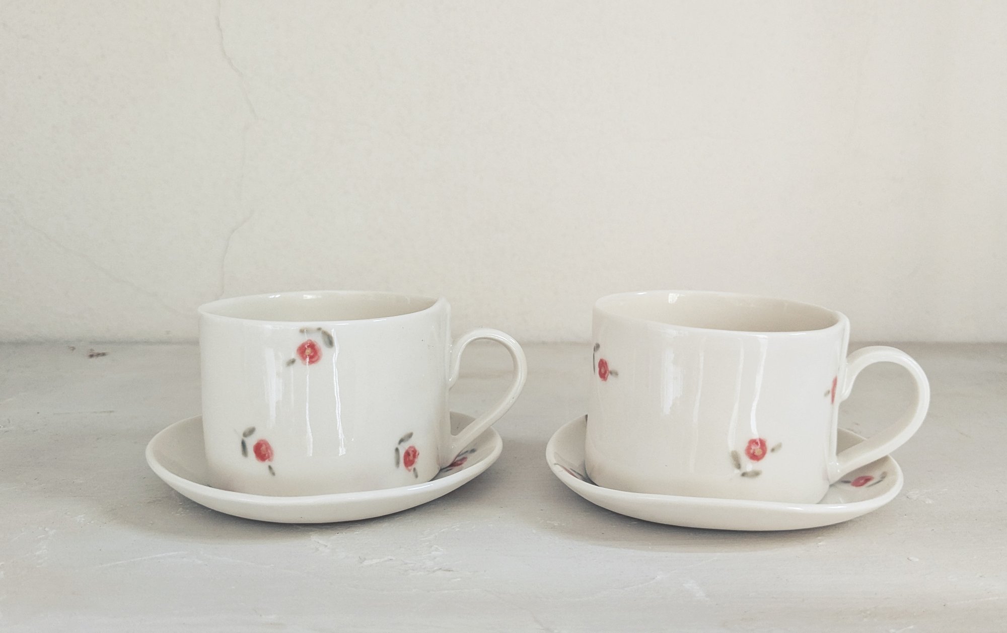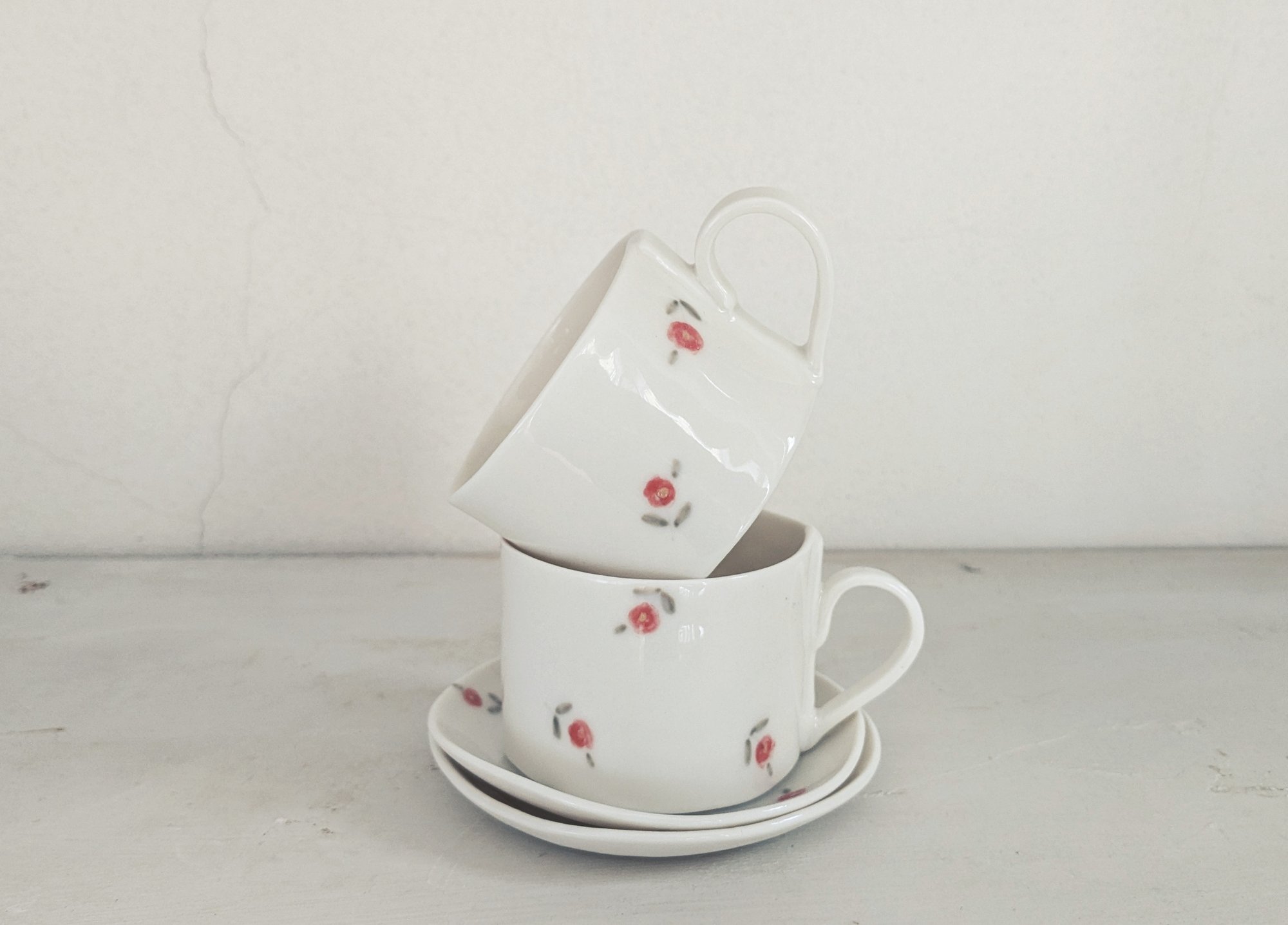 Porcelain cups with saucers completely hand-made and hand-painted.