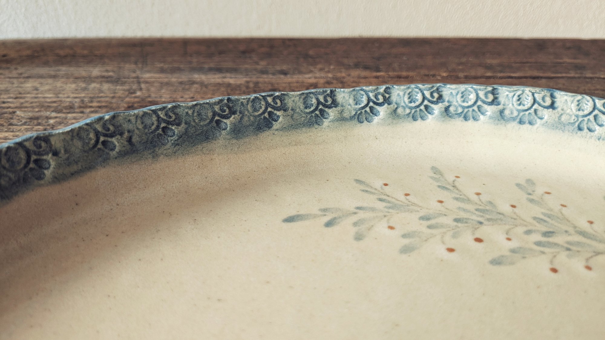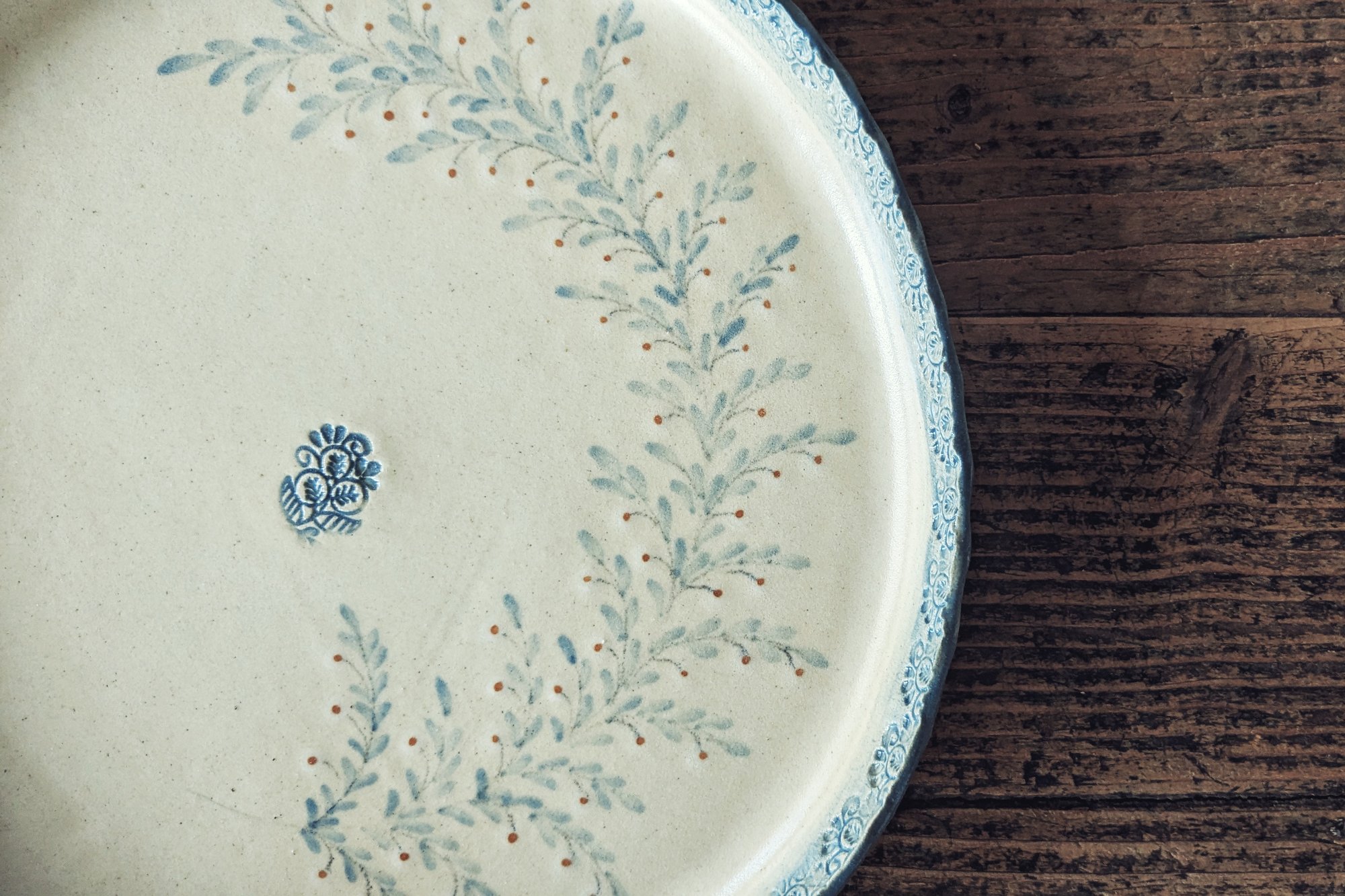 Tortiera in grès completamente realizzata e dipinta a mano.