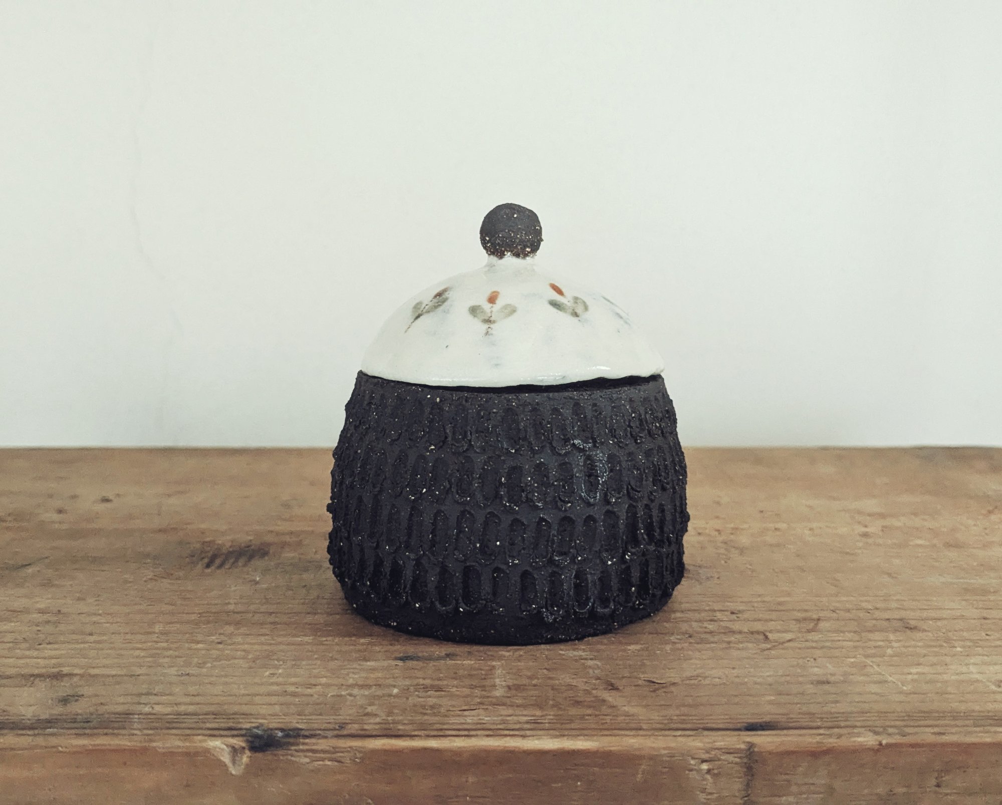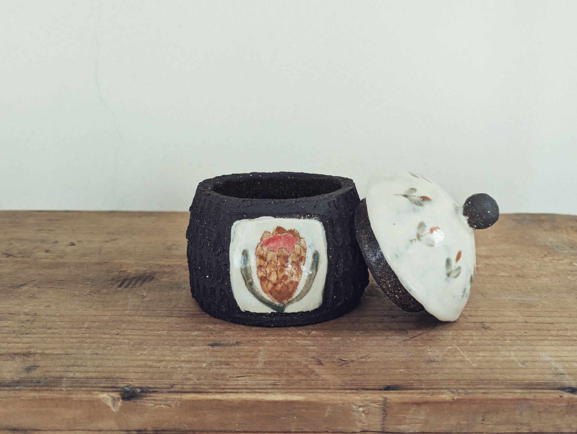 Scatolina in grès realizzata e dipinta interamente a mano.