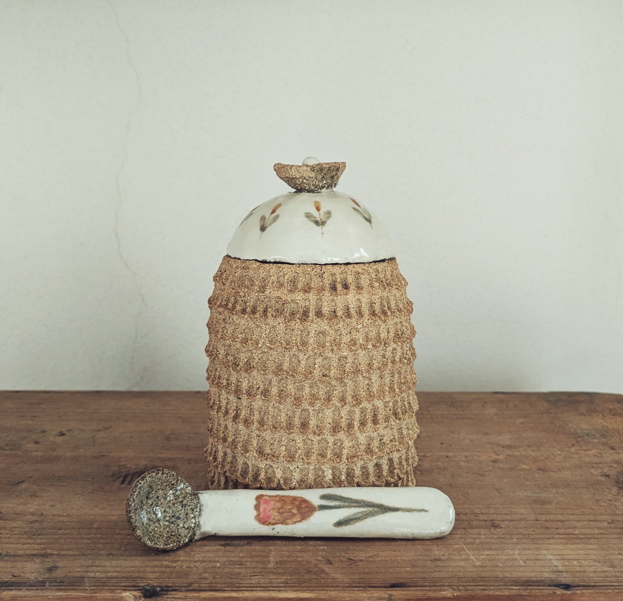 Sugar bowl with matching spoon in stoneware, completely hand-made and hand-painted.
