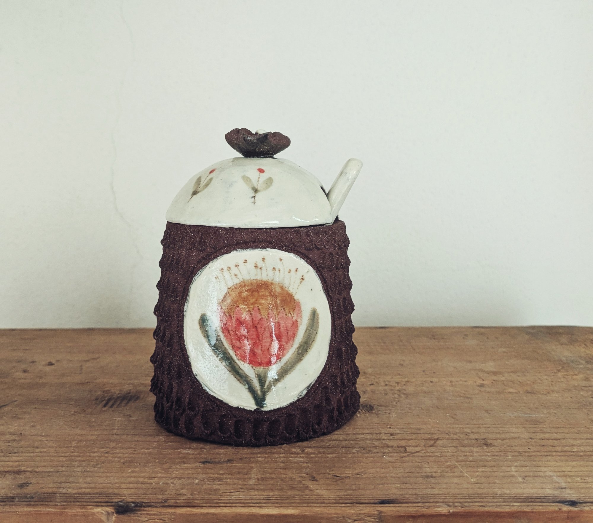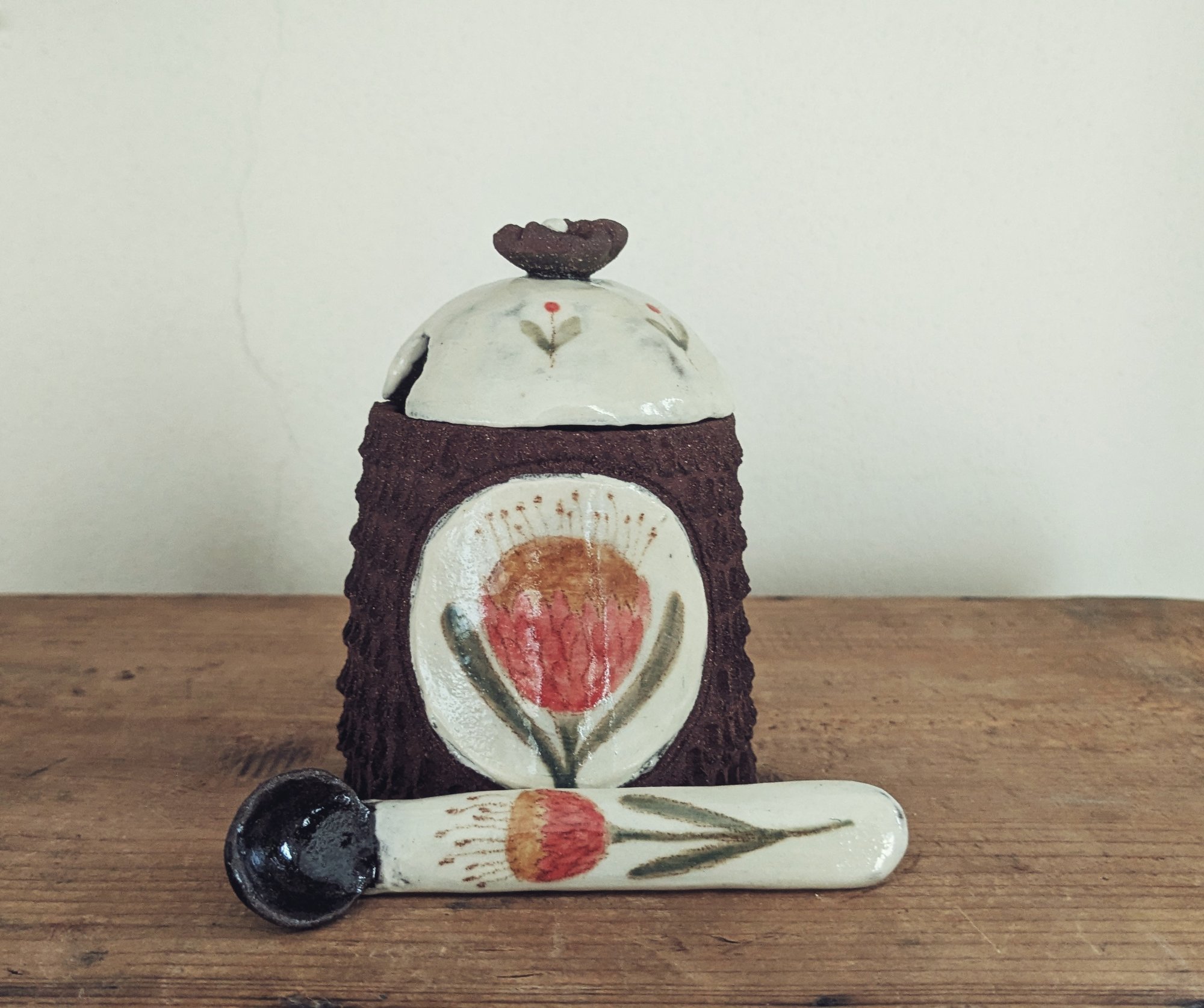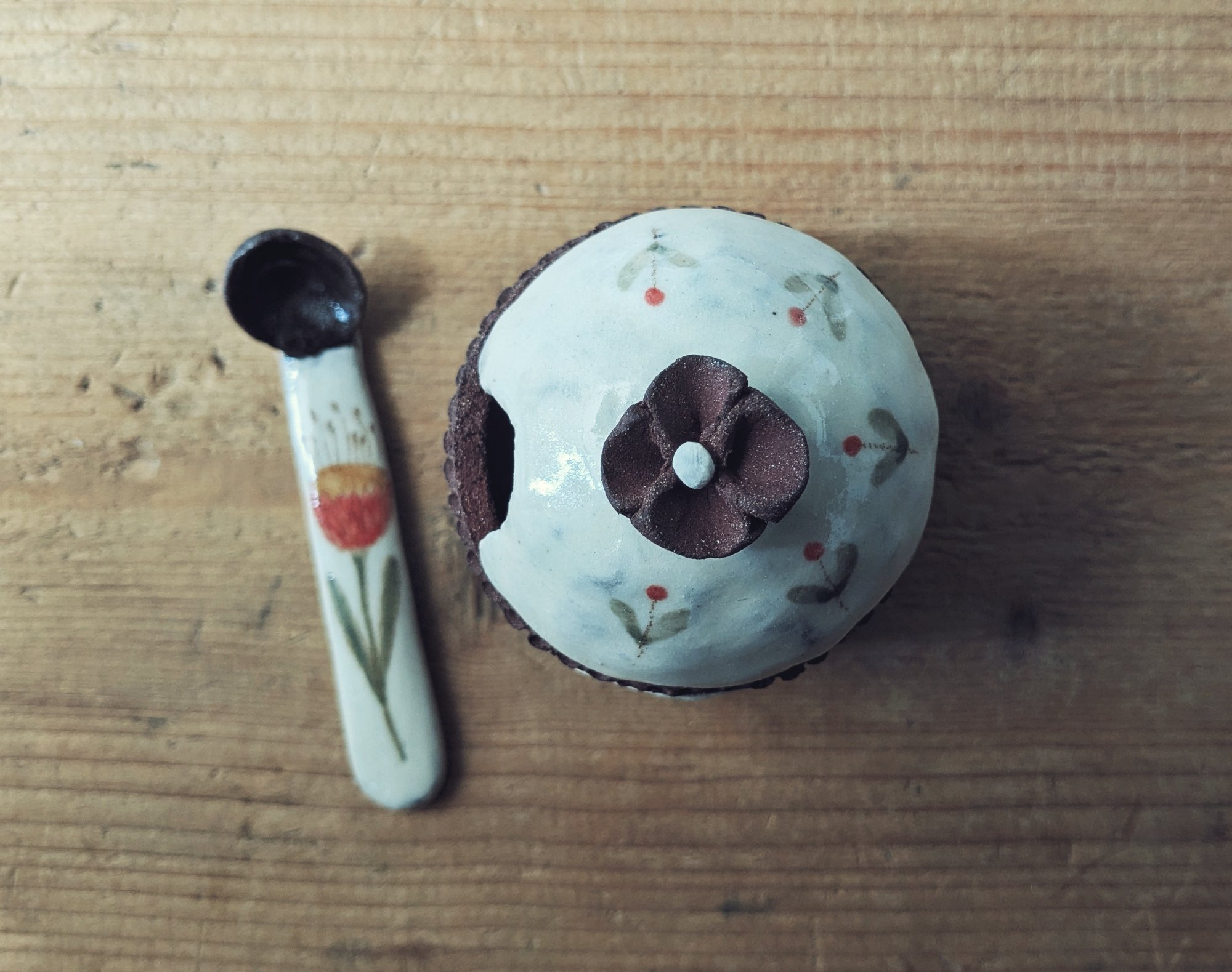 Sugar bowl with matching spoon in stoneware, completely hand-made and hand-painted.