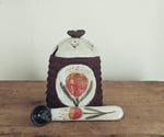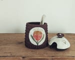 Zuccheriera con cucchiaino abbinato in grès, completamente realizzata e dipinta a mano.